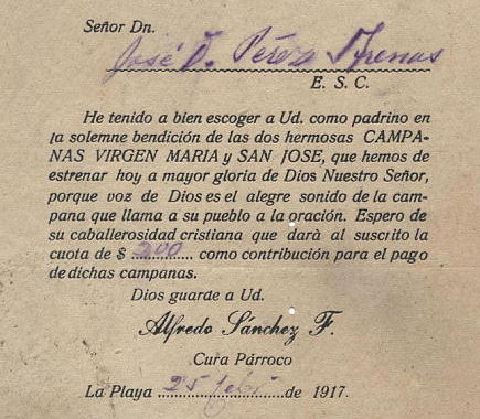 Sánchez F. Cura Párroco, La Playa 25 de febrero de l.917". En