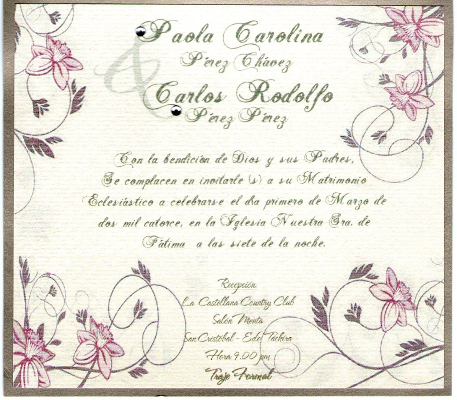 San Cristóbal, Estado Táchira, República Bolivariana de Venezuela, 2 de mayo de 2014. En solemne ceremonia, celebrada en la parroquia de Nuestra Señora de Fátima, a las 7:00 p.m., contrajeron matrimonio, el Ingeniero Mecánico Carlos Rodolfo Pérez Pérez y la Arquitecta Paola Carolina Pérez Chávez. La ceremonia religiosa estaba prevista para el 1 de marzo pero debió postergarse por razones de orden público. El matrimonio civil se había celebrado el 14 de diciembre en la ciudad de Maracaibo. El novio es hijo del ingeniero industrial Carlos Pérez Martínez y la señora Alba Marina Pérez Armesto, residentes en San Cristóbal. La novia es hija de don Humberto Pérez y la señora Nelva Isabel Chávez, residentes en Maracaibo, República Bolivariana de Venezuela. La recepción tuvo lugar en el Salón Menta de La Castellana Country Club. Fueron acompañados por familiares y amigos de Colombia y Venezuela. Cancún, México, fue su destino para la luna de miel. | |||