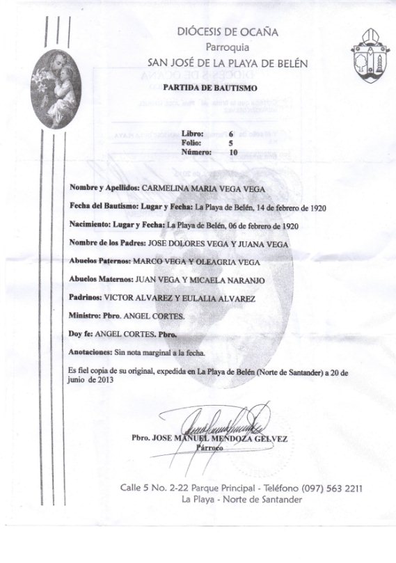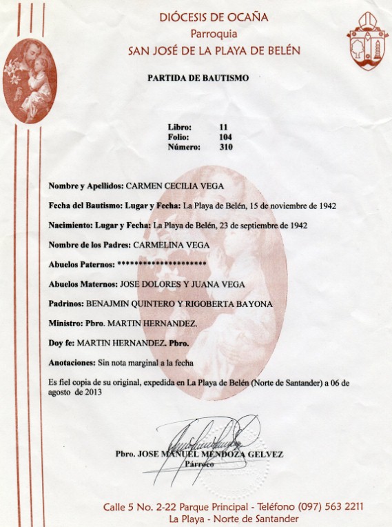 de bautismo de doña Carmen Cecilia Vega de Mora |