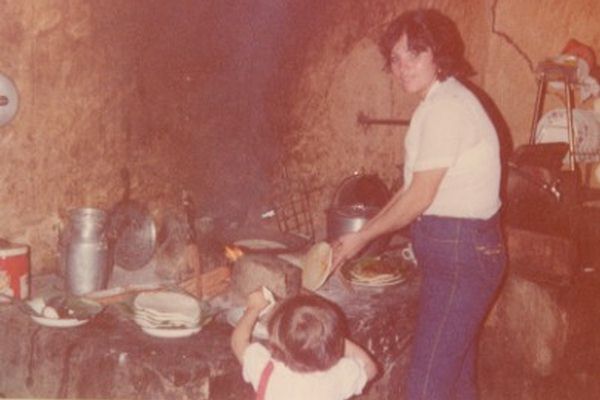 arepas en el fogón de leña. Su hija Adriana "le ayuda"